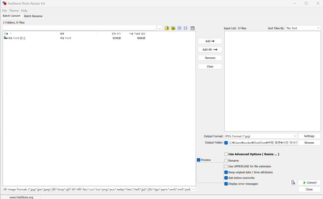 - 폴더에서 이미지 선택 → 오른쪽 옵션에서 "Resize" 체크
